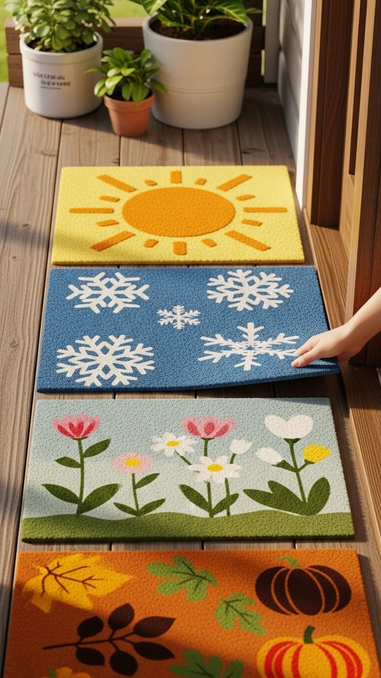 After your cottage garden canvas sets the mood, swap in a seasonally themed doormat to extend that welcoming feel right to the threshold. You’ll choose welcome mats that reflect sun, frost, blooms, or harvest—simple, bold designs that invite guests and lift your spirits. Themed swaps are quick, affordable, and let you express freedom through color and pattern each season.