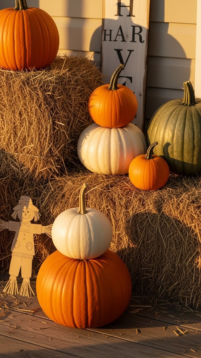 You’ll stack varied pumpkins, add a harvest silhouette sign, and tuck a simple scarecrow sketch on kraft paper for charm.