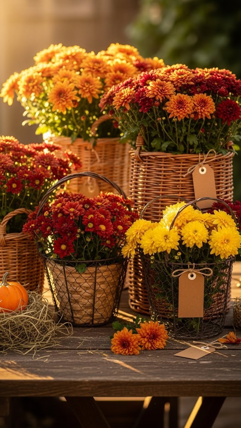After your pumpkin-and-hay vignette sets a cozy scene, bring richer color and texture with mums tucked into rustic baskets. You’ll love arranging them in woven baskets at different heights, letting petals spill freely. Add vintage tags for names or seasonal notes, tie them with twine, and position for easy watering. It’s simple, bold, and invites you to roam and relax.