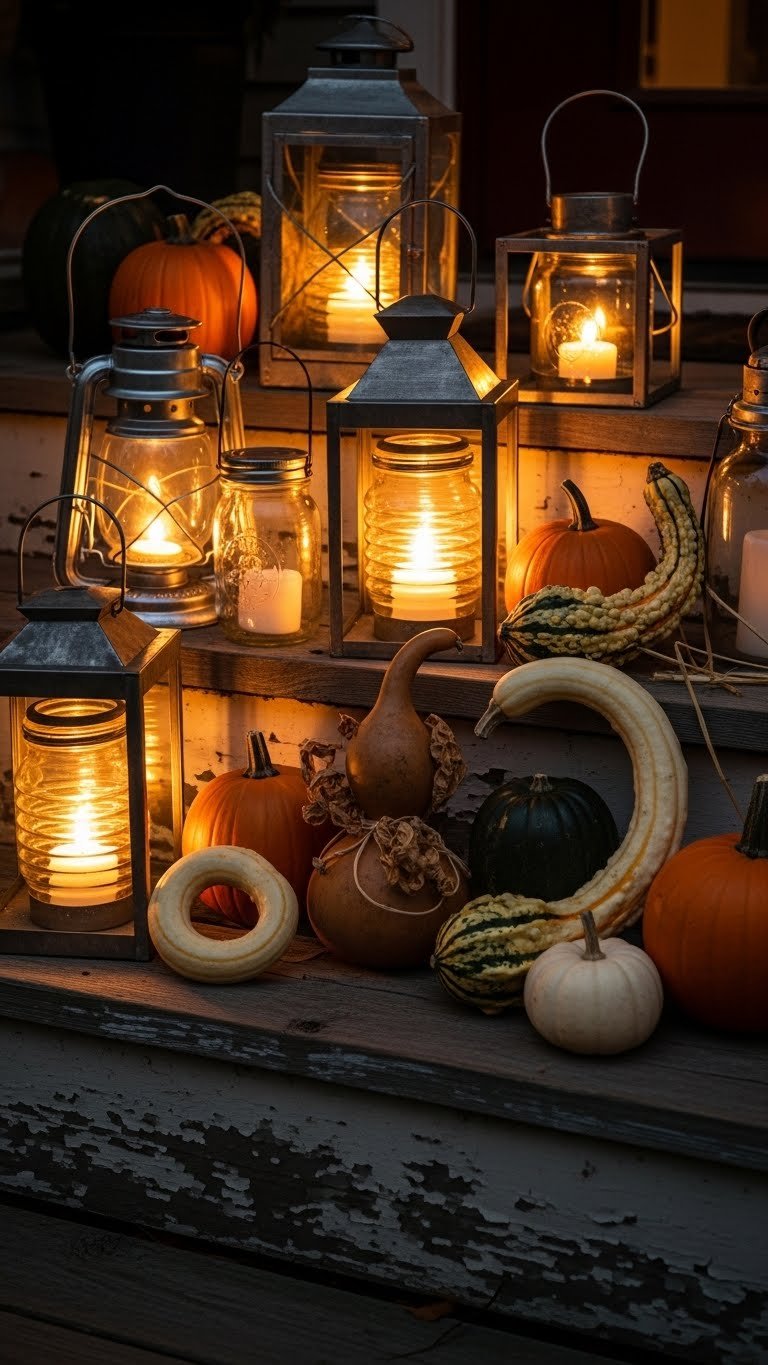 Set out a few lanterns and gourds to cast a cozy, layered glow across your porch—mix metal and glass lanterns with varying heights and tuck in a handful of pumpkins, curved gourds, and textured squash to balance light and organic shape. You’ll lean into mason lanterns for charm, arrange a dried gourd centerpiece, and place pieces so visitors feel welcome and free.