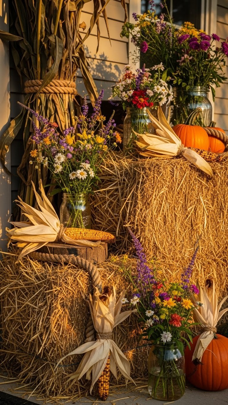 Bring corn husks and straw bales together to create a rustic, welcoming porch vignette that feels both natural and intentional. You’ll use corn huskals tucked into rope, mason jars, or tied around pumpkins, pairing them with straw bale styling for height and texture. Arrange freely, add seasonal greenery or wildflowers, and let the display feel effortless, bold, and inviting.