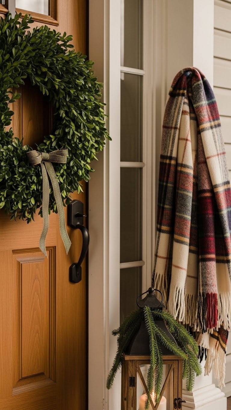 After you’ve enjoyed the layered warmth of plaid throws, carry that cozy, textile-rich feeling into winter by pairing a soft, oversized scarf with a fresh boxwood wreath on your door.