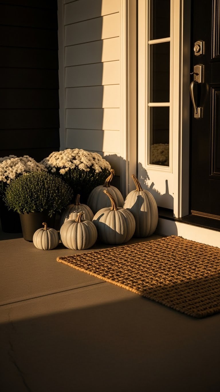 When daylight softens into amber, layer sharp blacks, creamy ivories, and warm taupes to create a fall porch that feels both dramatic and inviting. You’ll place Monochrome mums in simple pots, arrange Slate pumpkins for sculptural contrast, and add a textured runner. Keep lines clean, swap items seasonally, and let restrained neutrals free you to mix bold shapes without clutter.