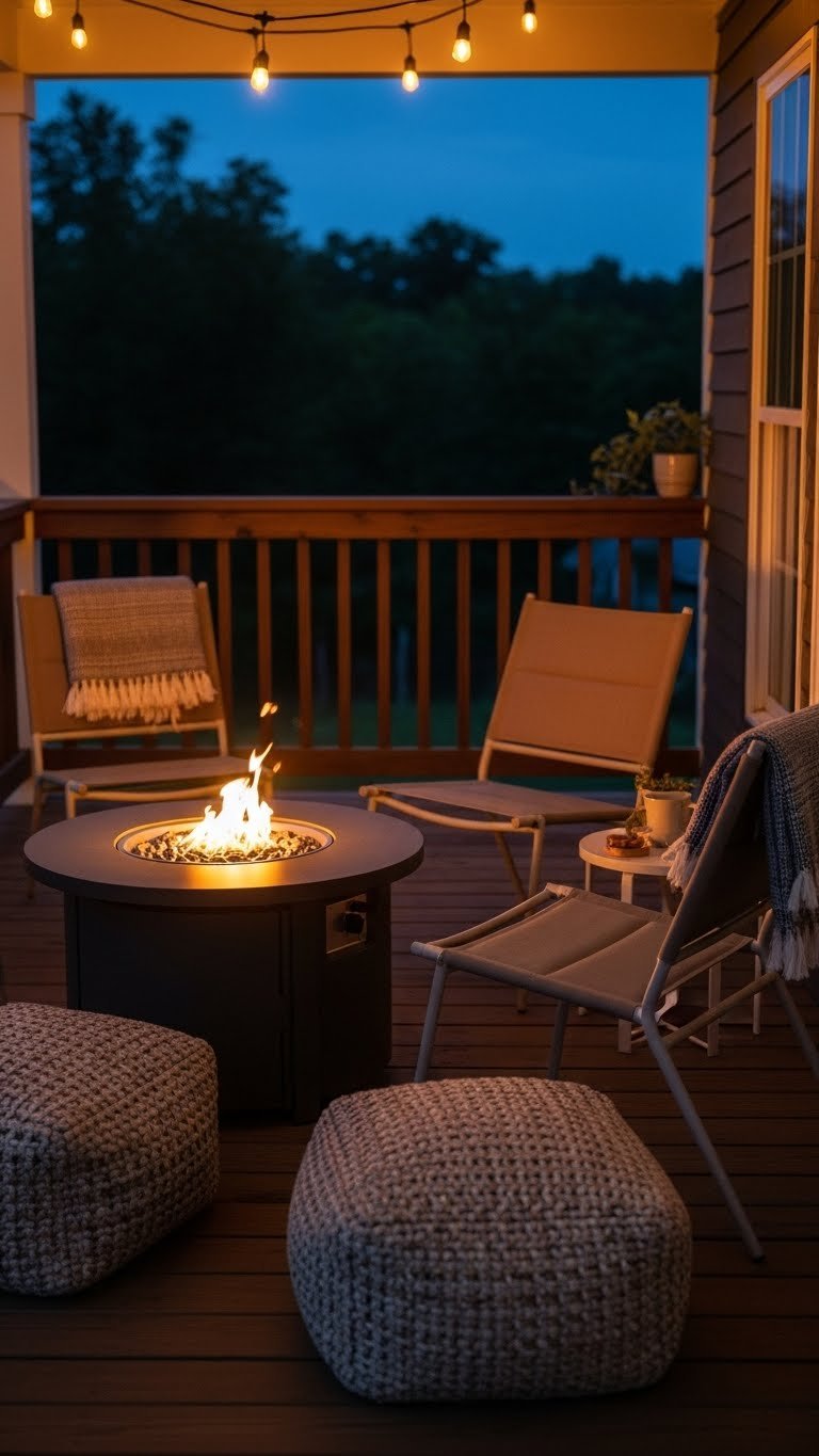 Pull a few lightweight chairs and a compact fire pit onto your porch to create a semi-portable seating area that feels cozy but won’t lock you into one setup.