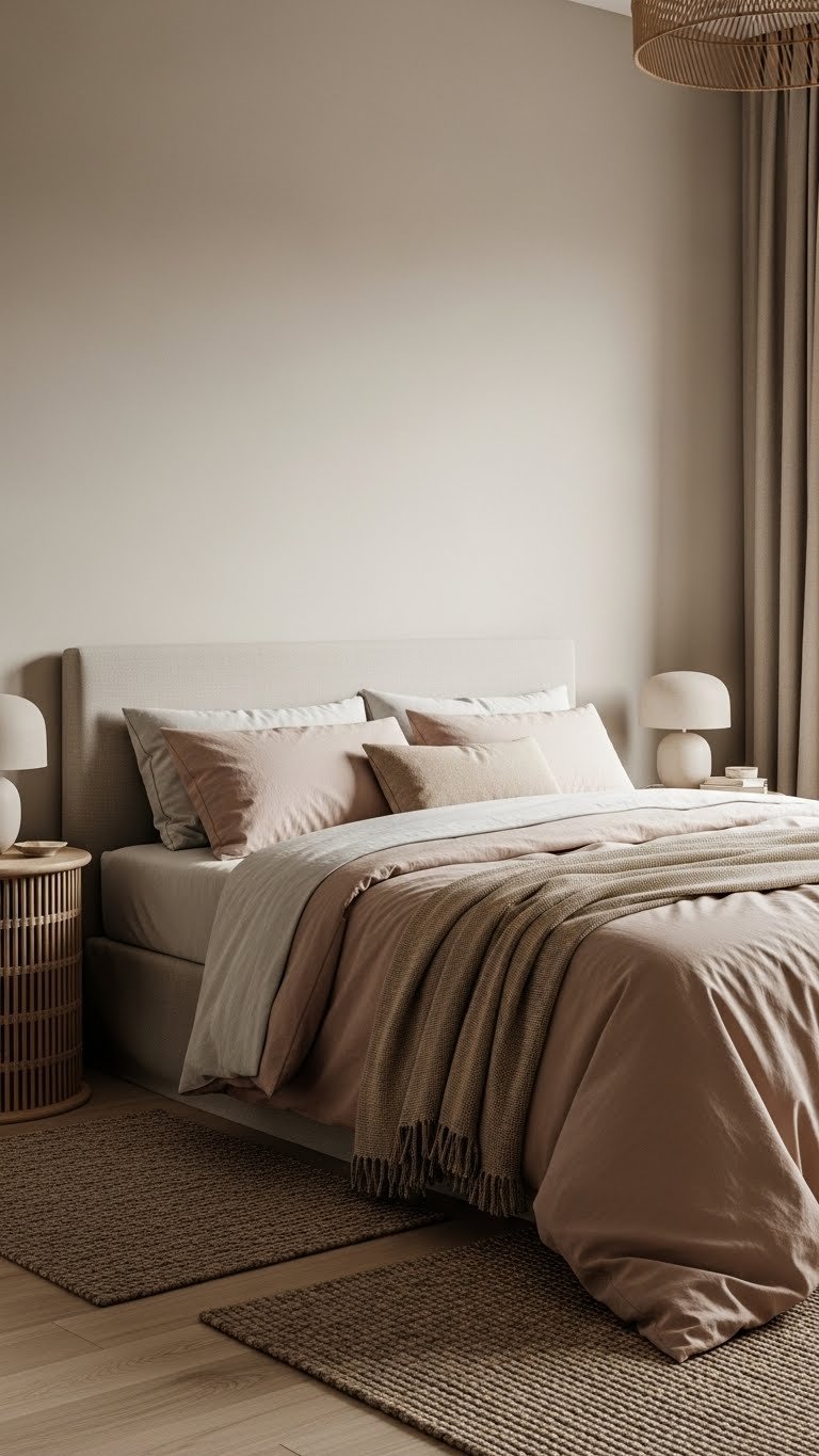 Choose peach throws, sculptural ceramics, and natural woods to keep the vibe liberated and intimate.