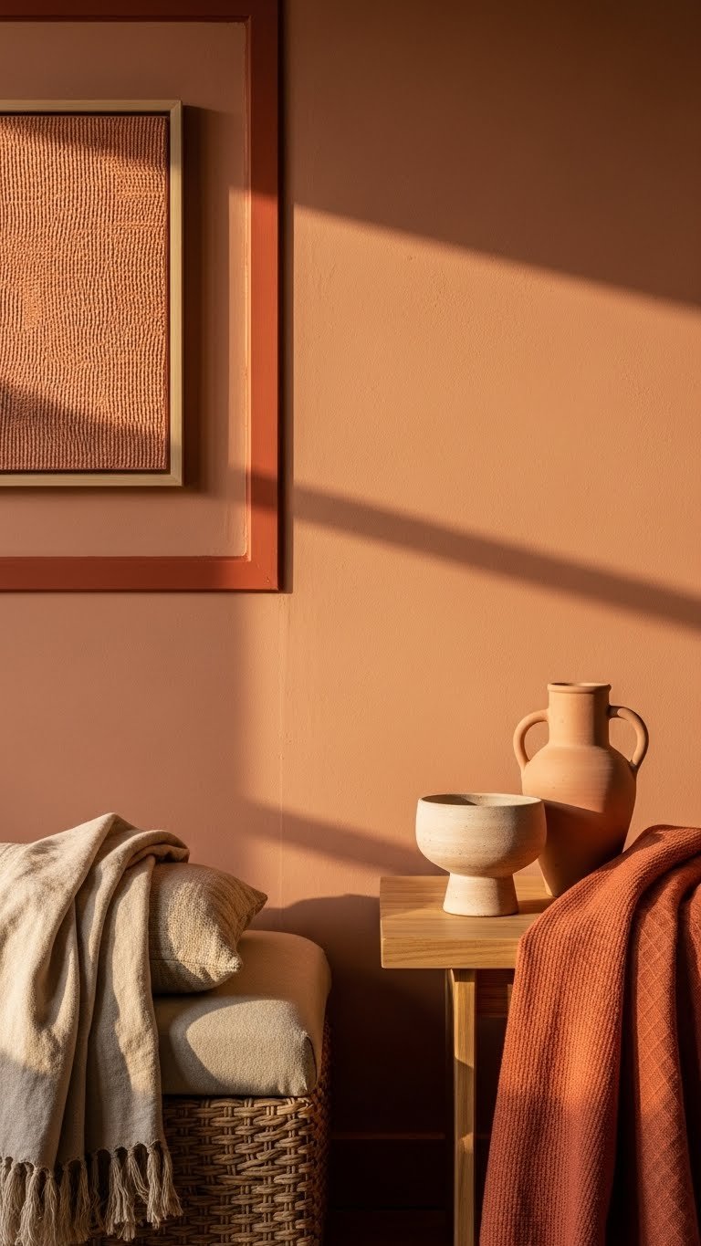Think of a terracotta accent wall as the warm backbone of the room: it grounds the space with earthy richness while letting peach accents lift and soften the overall palette.