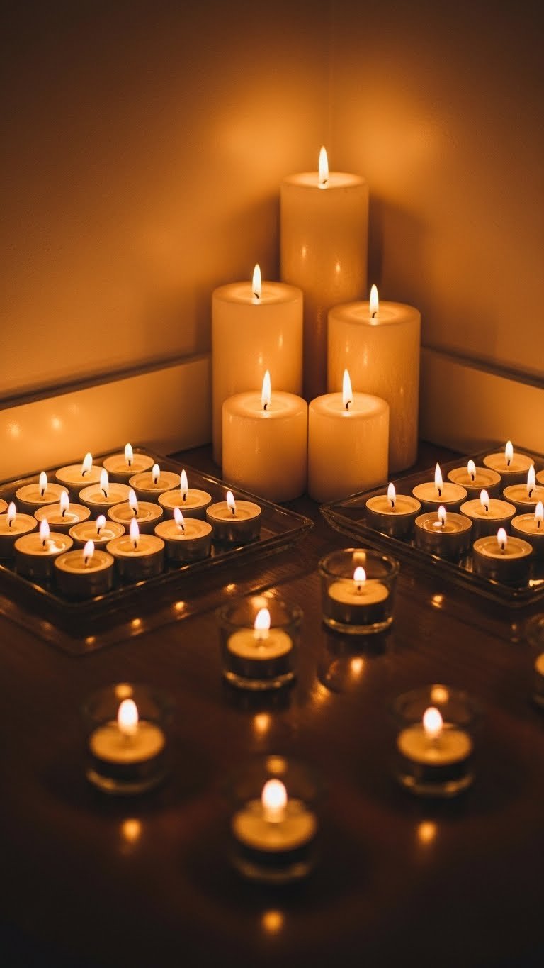 After you’ve set a gentle, programmable glow with dimmers, grouped candles add an irregular, flickering warmth that makes the space feel intimate and lived-in. You’ll arrange clustered tealights in glass trays, scatter low votives, and anchor a corner with tiered pillars to vary height. Choose unscented or subtle blends, trim wicks, and keep safe surfaces for a liberated, sensual atmosphere.