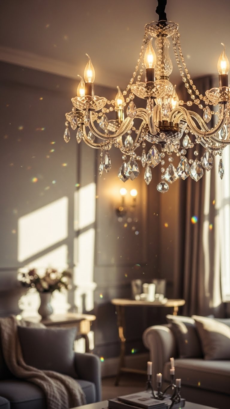 Suspend a crystal chandelier to instantly elevate the room, its faceted drops scattering warm light into skin-flattering highlights and delicate prisms that feel both glamorous and intimate. Choose pieces with transparent crystal provenance, then position for balance and sightlines. You’ll enjoy sculptural drama without clutter. Regular chandelier maintenance guarantees sparkle and safety, letting you reclaim freedom and sensual calm in a thoughtfully lit sanctuary.