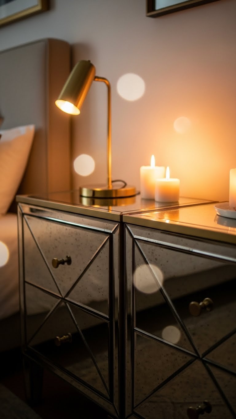 Bring mirrored nightstands into your bedroom to amplify light and add a touch of vintage glamour without heavy ornamentation. You’ll choose pieces—vintage mirrored or modern—whose geometric inlay catches lamp glow and reflects candles, widening the room’s mood. Pair them with minimalist hardware so surfaces sing; they create luminosity and open space, giving you freedom to style confidently and keep the focus on intimate ambiance.