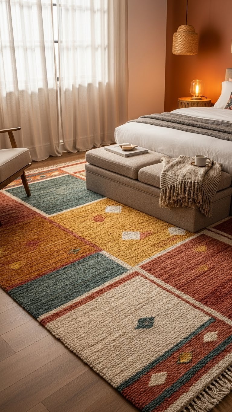 Anchor the room with a statement rug that defines your sleeping area and ties together color, texture, and scale.