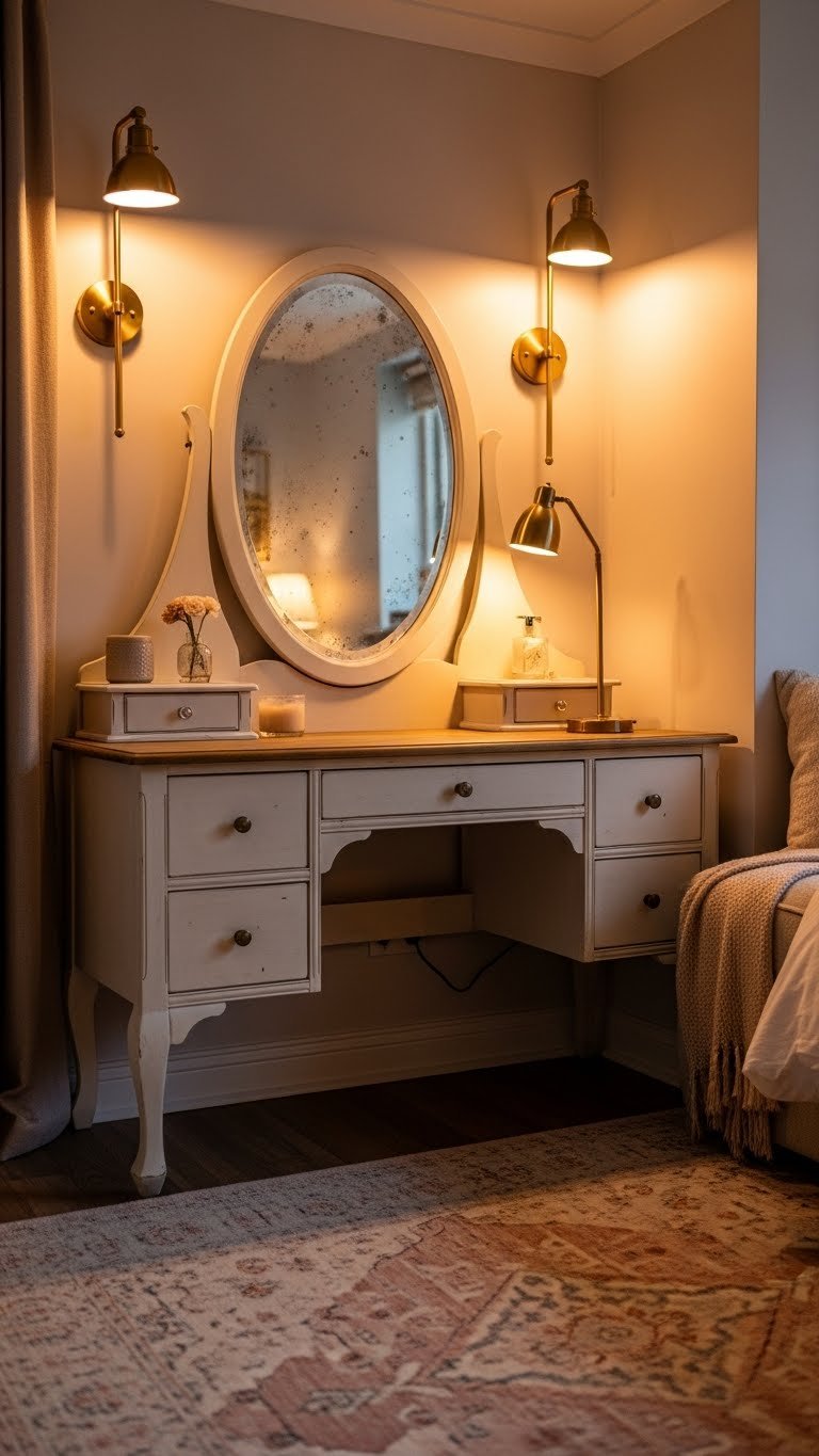 Once your statement rug settles the room, introduce an antique or gracefully curated vanity to bring intimate ritual and soft glamour into the space. You’ll choose a vintage mirror, delicate brass hardware, and tactile drawers for cherished items.