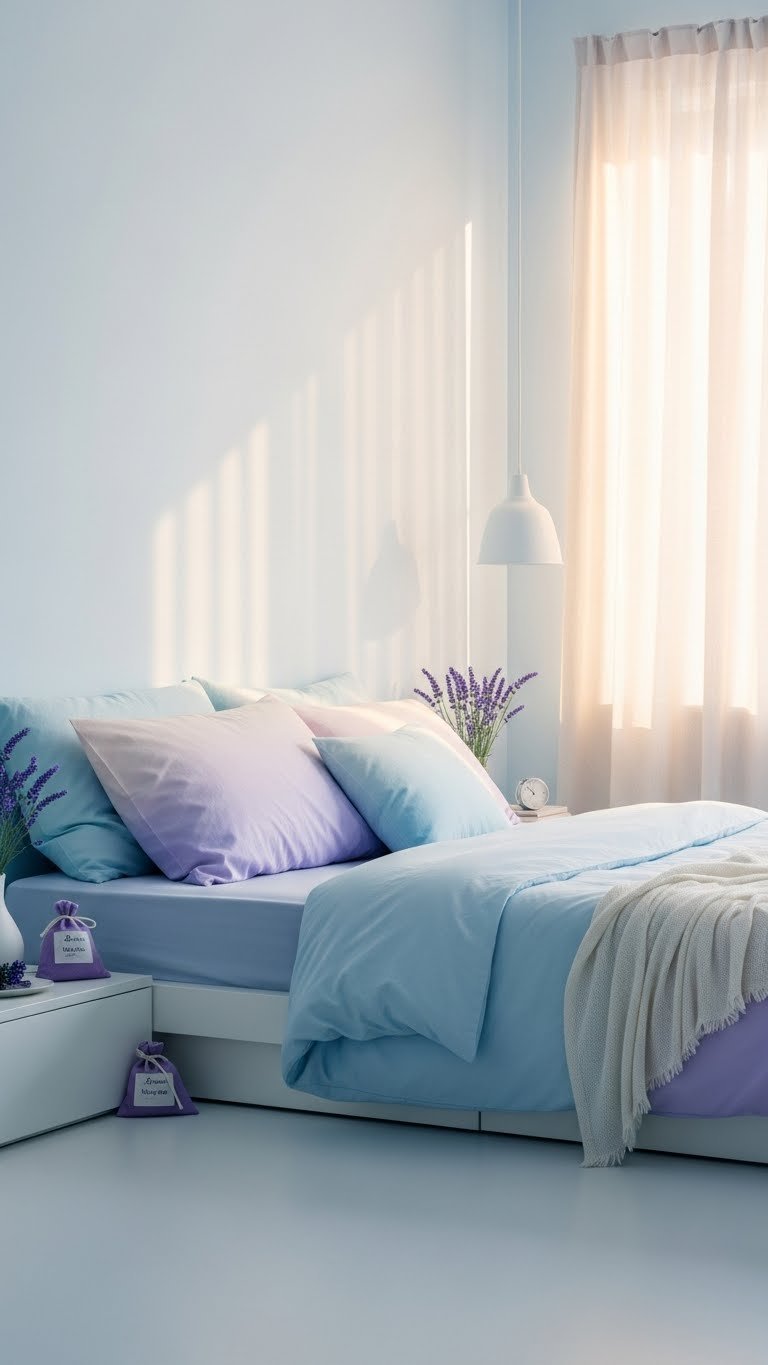 Soft washes of blue and lavender quietly soothe a bedroom, inviting you to breathe deeper and unwind. You’ll layer pillows, throws and drapery in pastel gradients to create open calm, while a thoughtful lavender pairing—small blooms, scented sachets—anchors scent and sight.
