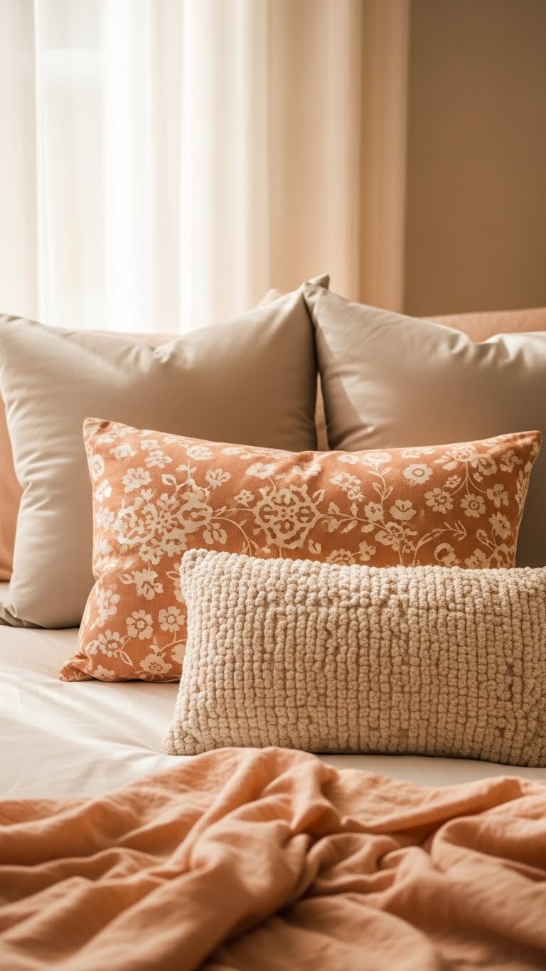 You’ll mix peach textures—silk, linen, brushed cotton—to add depth, then refine your pillow arrangement for balance: two larger neutrals at the back, a patterned peach mid, and a small textured accent up front to invite touch and ease.