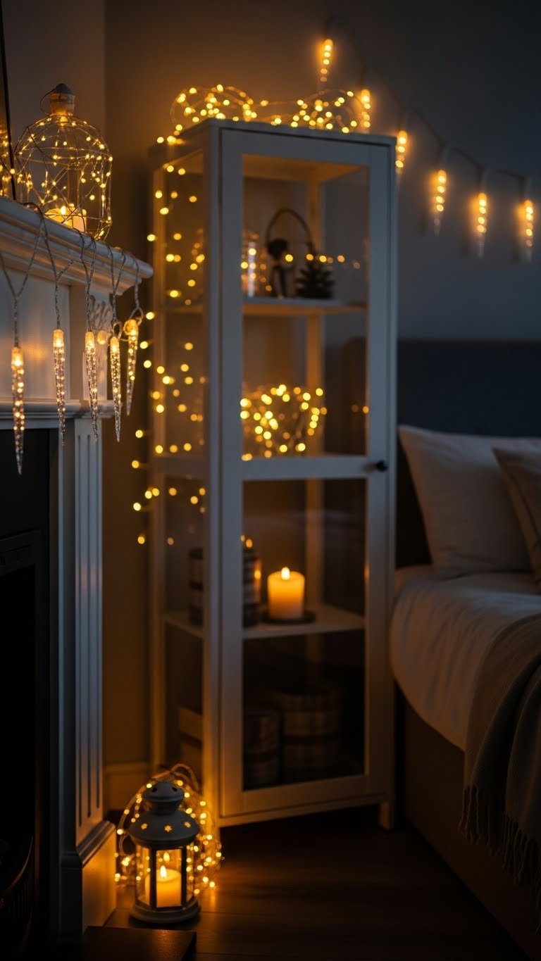 Kick off the year by draping twinkling string lights around unexpected spots—think along mantels, bed headboards, or inside glass-front cabinets—to extend holiday glow into cozy winter nights. You’ll pair warm-white strands with wireframe silhouettes and subtle icicle clusters for layered texture.