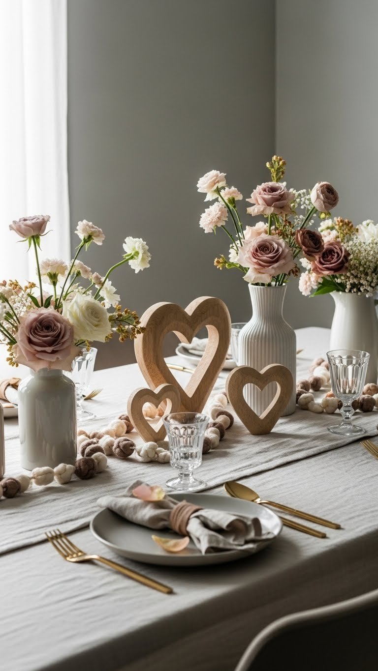 When you want to bring Valentine’s charm to the table without going full cliché, craft heart-themed centerpieces that feel modern and intentional. You’ll mix sculpted wooden hearts with soft blooms, drape handmade garlands loosely, and anchor arrangements in eclectic vintage vases. Keep palettes muted, textures varied, and negative space purposeful so each piece reads as liberated, curated, and effortlessly chic for February gatherings.