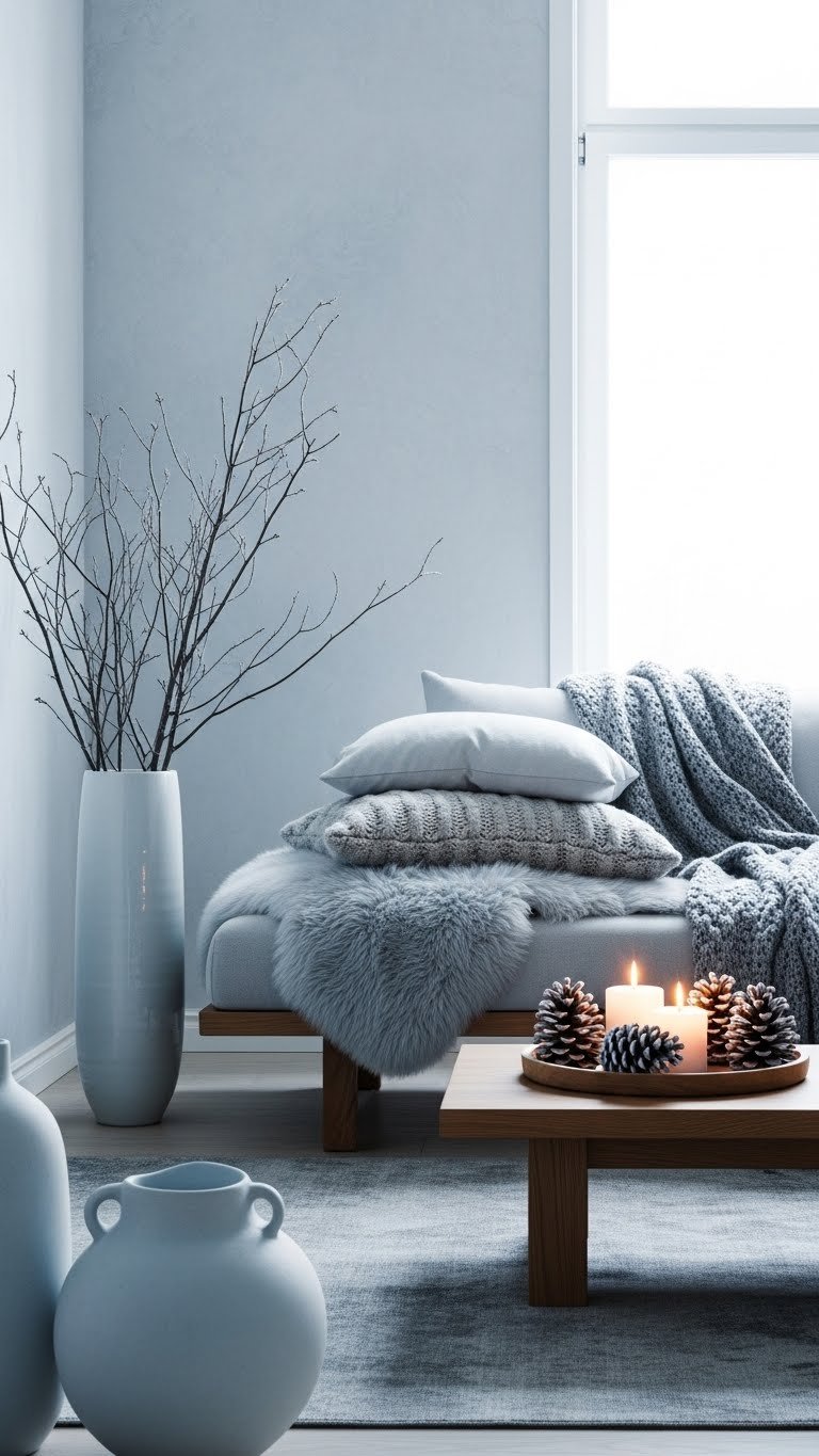 Although the holidays are over, you can keep winter’s quiet magic without any Christmas references by leaning into a cool, textural palette and nature-forward accents. Layer faux fur throws over minimalist sofas, add sculptural branches and frosted pinecones, and light cinnamon scented candles for cozy warmth.