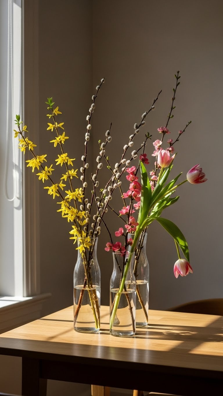 Wake your rooms with early-spring stem displays that feel deliberate yet effortless: pick a handful of long, sculptural branches — forsythia, pussy willow, flowering quince, or early tulips — and give each variety room to breathe in tall, simple vessels.