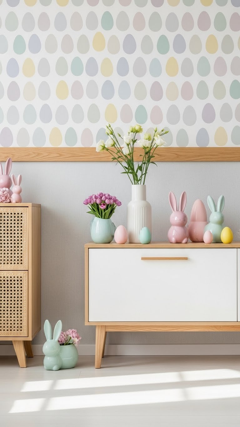 Keep the fresh, airy feeling from your stem displays but add a playful, polished nod to Easter with a few well-chosen bunny and egg accents. You’ll mix subtle motifs like bunny shaped planters and pastel ceramics with a statement wall—think soft, modern egg patterned wallpaper. Keep lines clean, textures layered, and let whimsical details feel intentional, not cluttered, so your space breathes freedom.