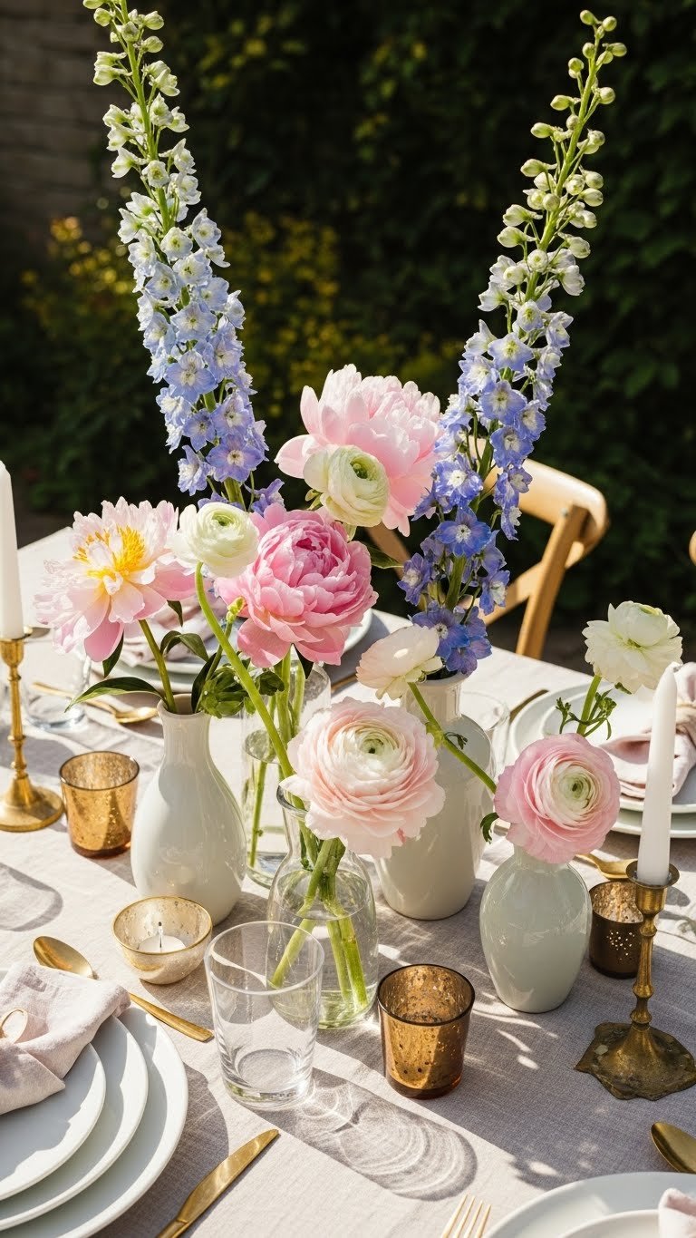 As May arrives and Mother’s Day nears, set a floral tablescape that feels effortless yet thoughtfully curated; choose seasonal blooms like peonies, ranunculus, and delphinium in mixed-height vessels to create a layered, garden-fresh look.