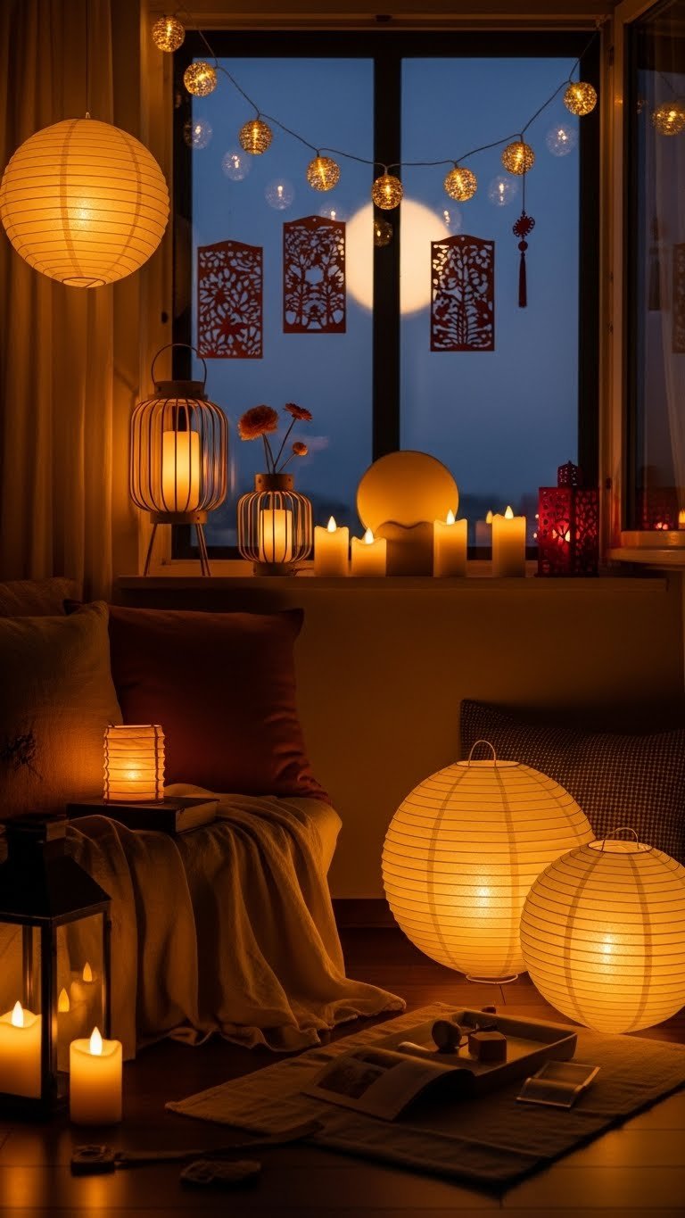 After swapping heavy duvets for breathable layers, you can carry that same thoughtful, tactile approach into September by planning Mid-Autumn Festival lighting that balances glow and atmosphere. You’ll choose lantern symbolism-driven palettes, mix warm LED candles with rice-paper shades, and layer string lights for depth. Add delicate paper cuttings as window silhouettes to invite moonlit freedom and sculpted shadows that feel both modern and ceremonial.
