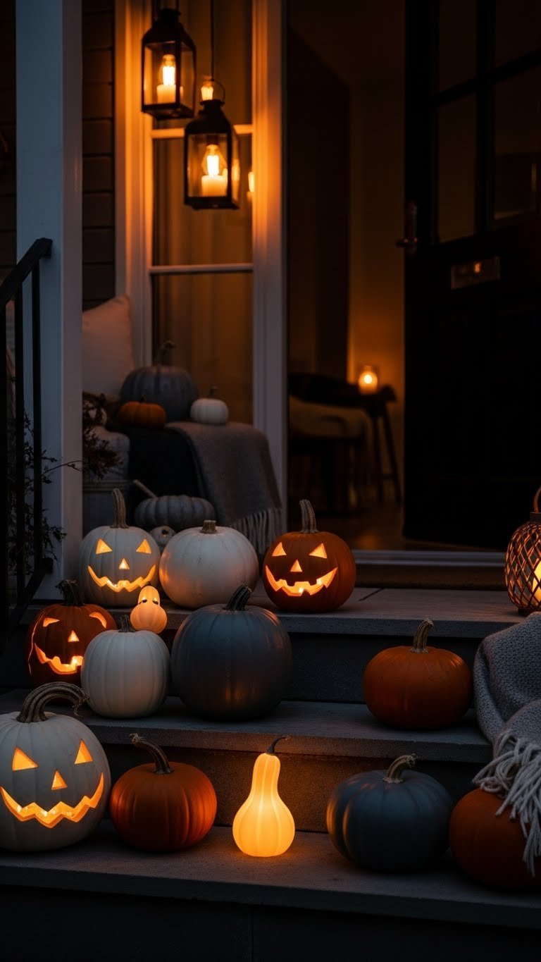 You’ll arrange glow gourds on steps, mix carved and painted pumpkins in matte tones, and hang lantern silhouettes in entryways.