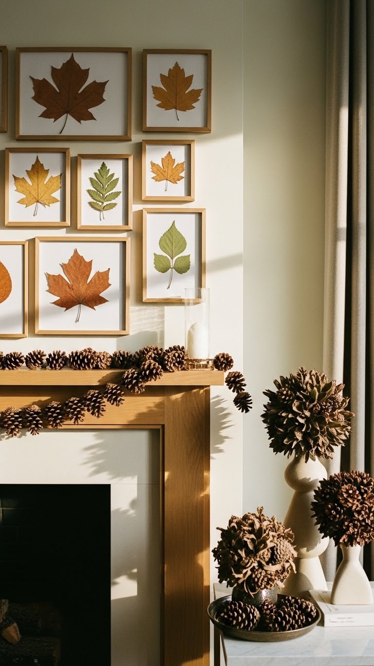 As daylight thins and your porch pumpkins shift into subdued shadows, bring that same refined autumn energy inside with crafted leaf and pinecone displays that feel curated, not cluttered. You’ll press pressed leaves into frames, mix textures, and string pinecone garlands across mantels. Opt for muted palettes, varied scales, and open arrangements so each piece breathes and your space stays free and intentional.