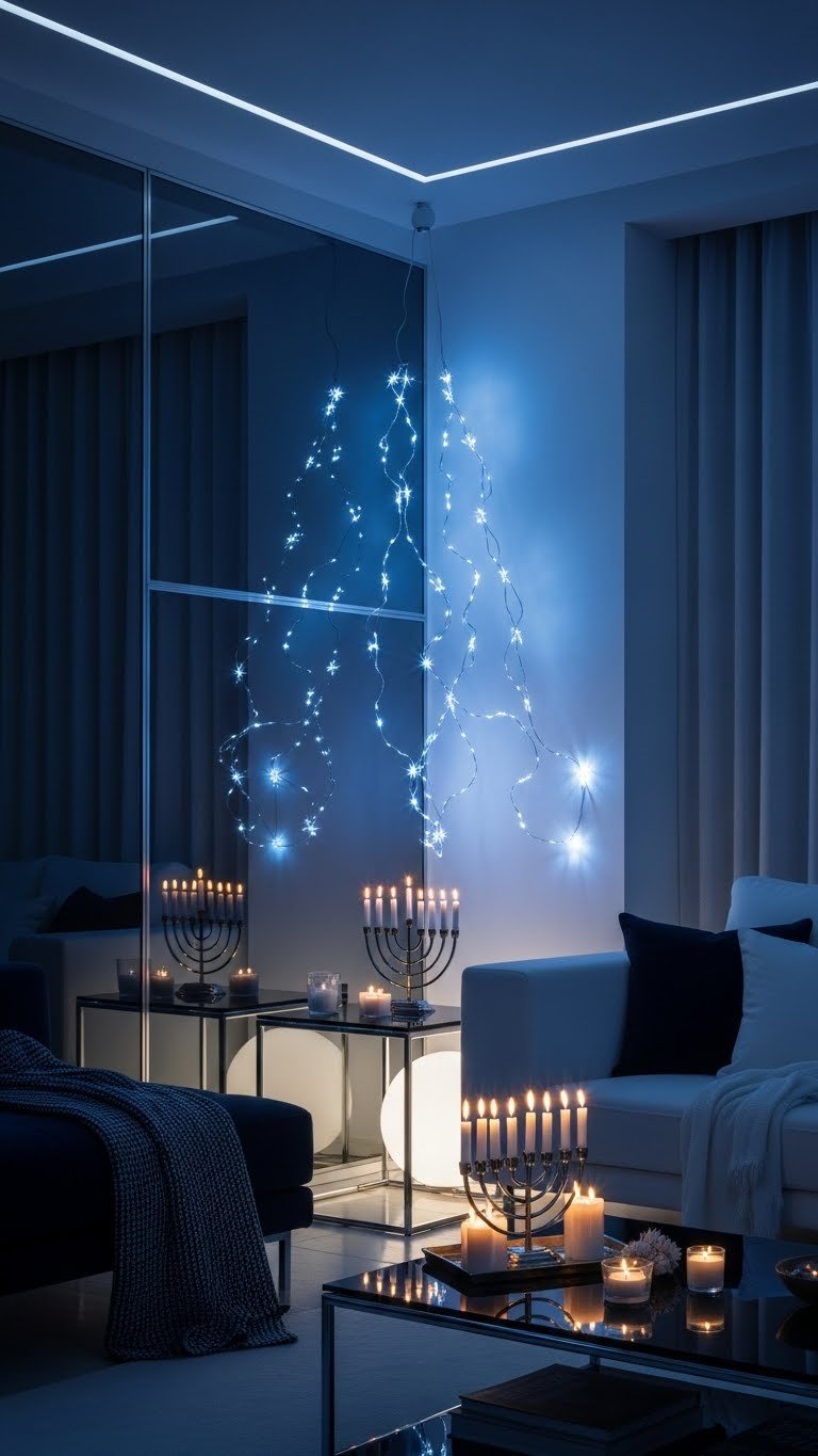 When you swap autumn’s amber for Hanukkah’s crisp blues and whites, aim for layered lighting that feels modern, calm, and celebratory rather than cold. You’ll mix cool LED strands, candlelight, and a statement ceremonial menorah; balance reflective surfaces with matte blue white textiles; add dimmers and warm bulbs to soften edges. Let each glow feel intentional, freeing your space to shine.