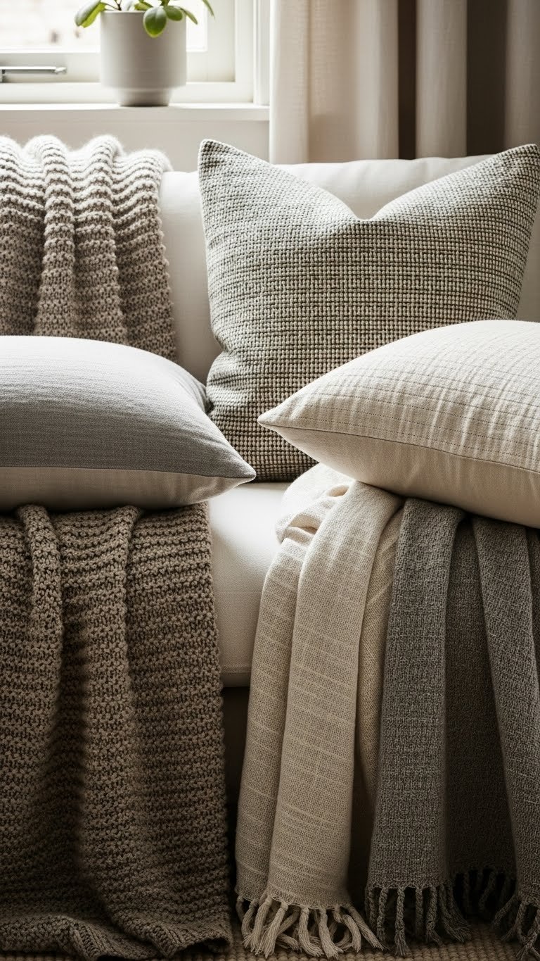If you want a single, foolproof system that adapts with the seasons, start with a neutral base layer of throws and pillows in durable, textured fabrics—think slub linen, tightly woven cotton, and low-pile wool—in warm greys, soft taupes, or off-white. Then add modular throws and reversible pillows for swift mood swaps; mix one sculpted knit, one lightweight weave, and a single patterned accent for freedom.