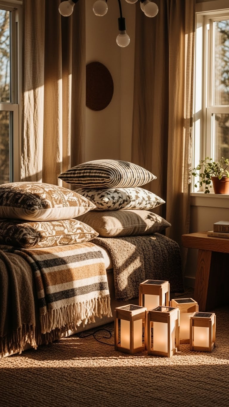 Add solar lanterns for mood and portability, LED bulbs, and locally made accents to cut waste while staying stylish and liberated.