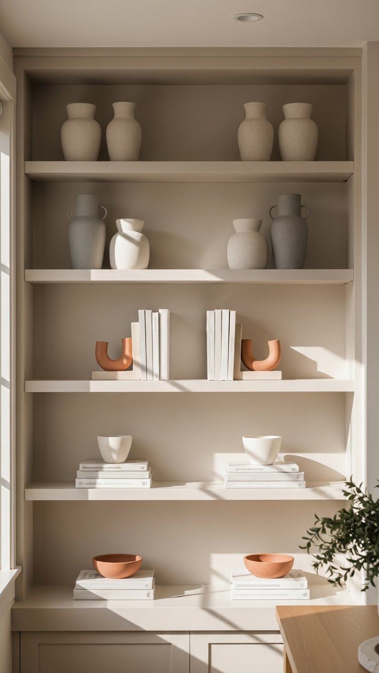 When you pare a shelf back to a single color family, the result reads as intentional and modern rather than sparse — mono palettes sharpen form and texture, so your eye notices curves, matte glazes, and subtle patinas instead of competing hues.