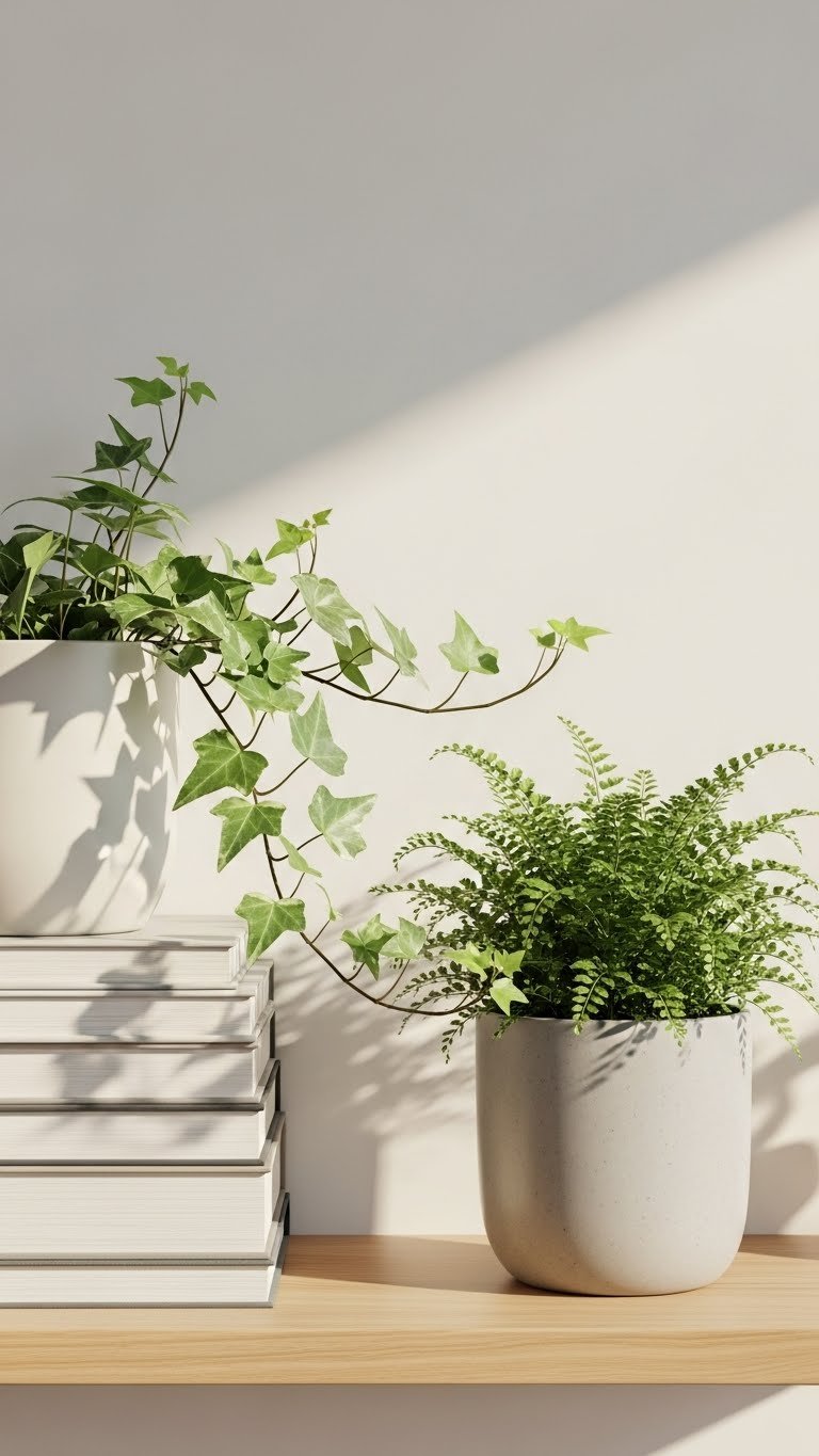 Often, you’ll soften a shelf’s angular lines by introducing varied greenery that brings life without cluttering the composition. You’ll pair draped ivy to trail gently over a stack, balancing heights with a compact potted fern for texture. Choose simple pots, rotate plants for light, and leave breathing room so each piece feels deliberate — a liberated, modern take on effortless, curated calm.