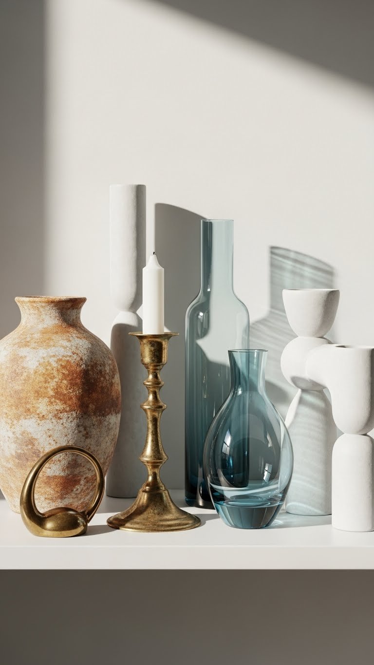 Mix tall lamps, low sculptures and medium vases to create visual rhythm. You’ll balance scale, negative space and texture, choosing pieces that feel free and intentional so each vignette reads as curated, not cluttered.