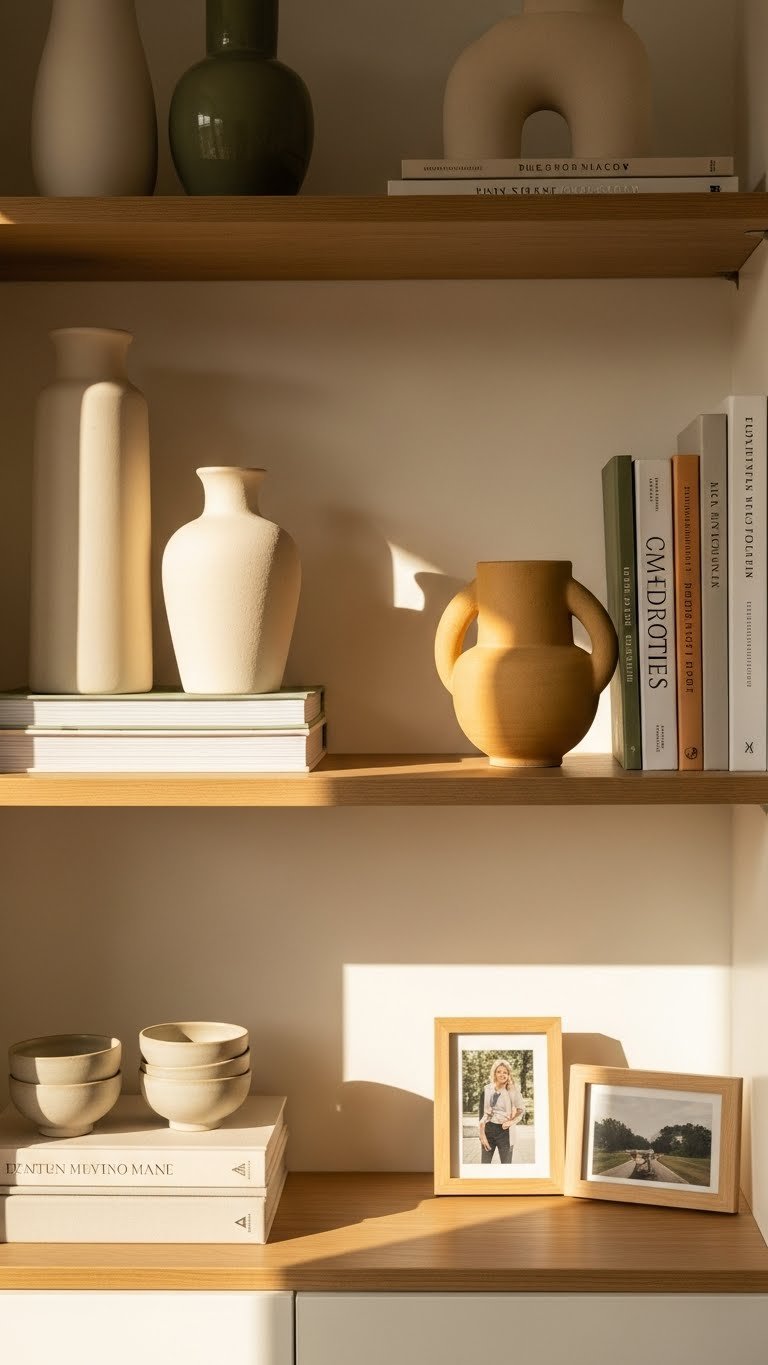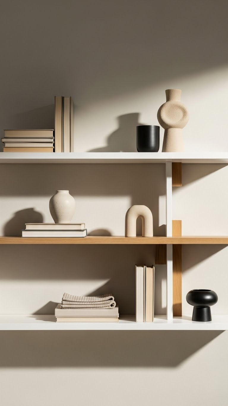 Mixed heights give your shelf its rhythm, and horizontal book stacks act as subtle risers that elevate objects without shouting for attention. You’ll use stacks as wood risers or minimalist book pedestals, balancing texture and scale. Layer a small plant or sculptural object atop a low stack, and let negative space breathe — it feels modern, intentional, and quietly liberating.