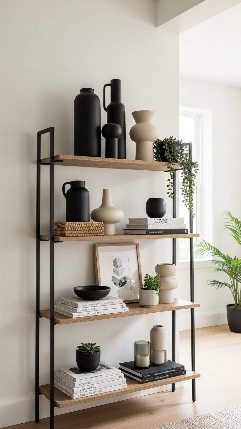 Make a bold single statement piece the focal point of your shelf by choosing one oversized or visually striking object—think an architectural vase, sculptural lamp, or vintage artwork—and arranging everything else to support it rather than compete.