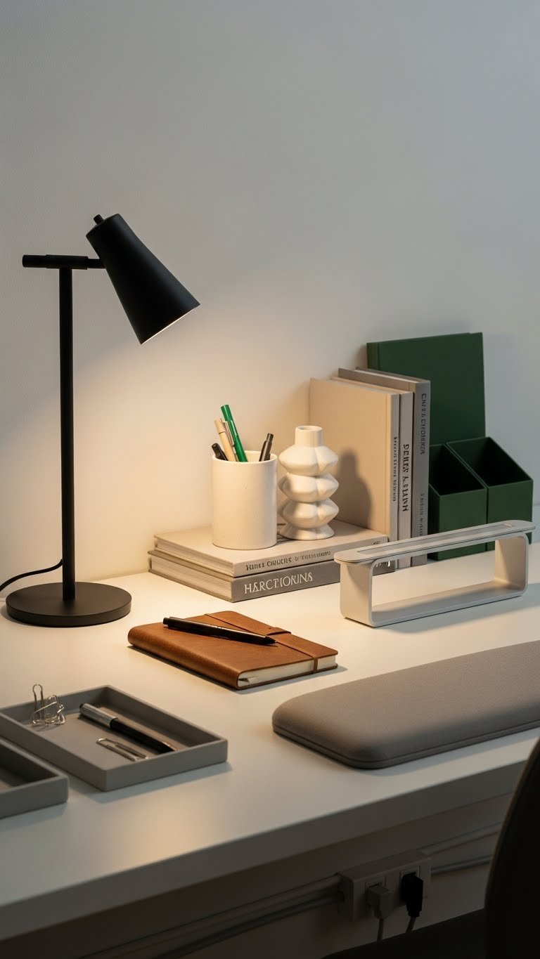 Pull together a curated workspace by balancing function and form: choose a slim desk lamp, a neat stack of reference books, a tactile notebook, and one or two sculptural organizers so every item earns its place and supports focused work. You’ll add ergonomic accessories, minimalist trays for supplies, and discreet cable management, creating a liberated, efficient shelf that feels intentional and ready for creative momentum.