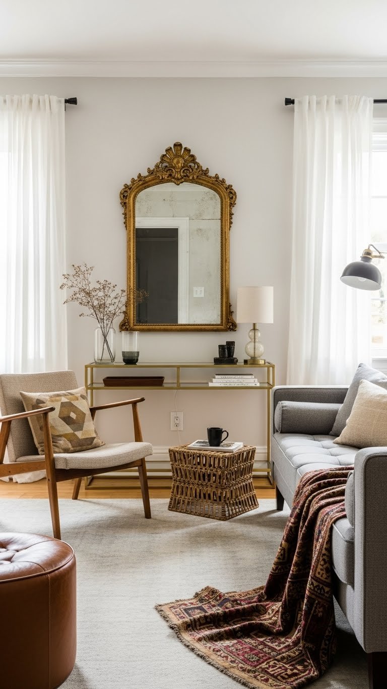 Bring in a few vintage accents to anchor modern pieces and give your space personality. You’ll mix antique mirrors with sleek furniture, layering retro textiles on chairs or draped over sofas for warmth and character.