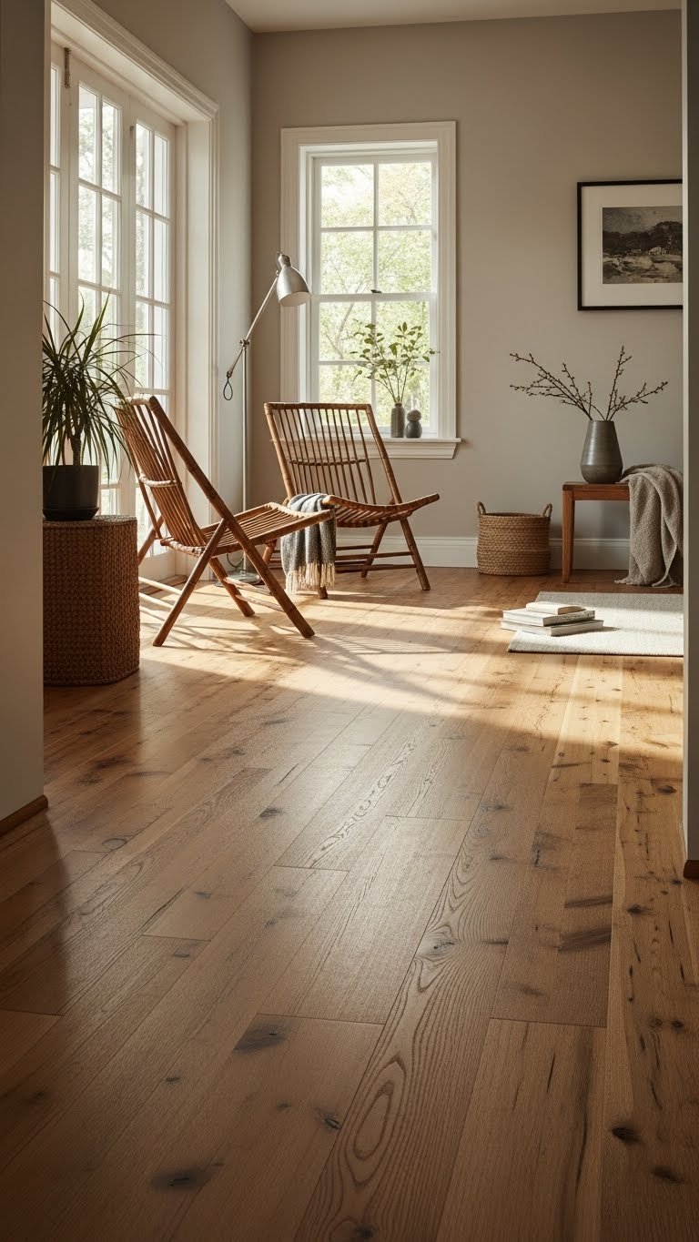 Opt for low‑VOC finishes, wide planks, and simple trims so spaces feel open and free.