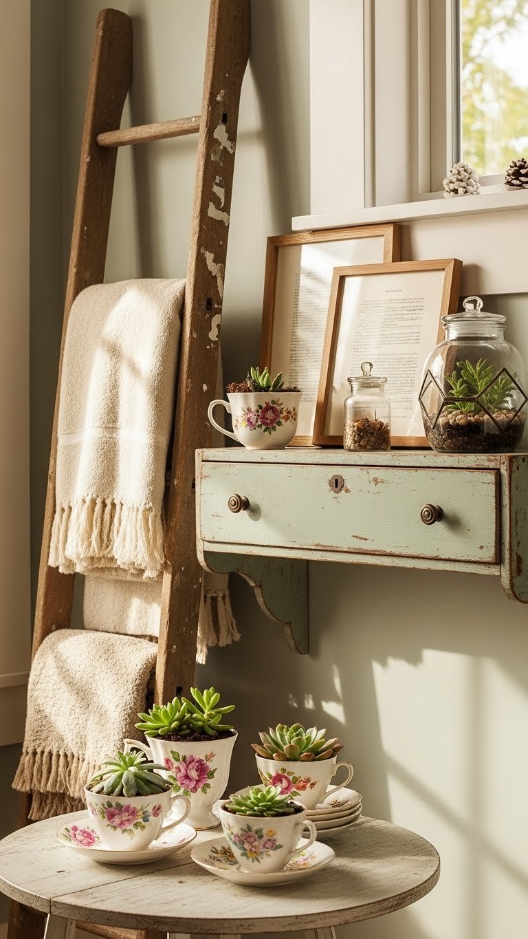 Give old things new life by seeing their potential beyond original uses: a vintage ladder becomes a blanket rack, mismatched teacups turn into tabletop planters, and an unused drawer finds new purpose as a shelf. You’ll love mixing an upcycled ladder with a painted drawer front, framing book page art for personality, or styling a jar terrarium to bring free-spirited, functional charm into your space.