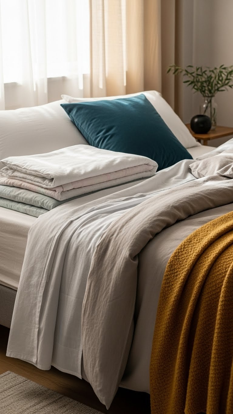 When the seasons shift, swap out your bedding to match temperature and mood—lighter linens and breathable cottons for summer, layered linens and a plush duvet for winter.