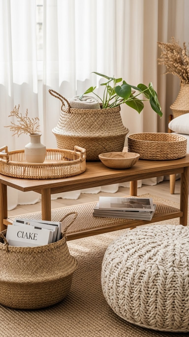 Those same woven pieces that warm your living room work beautifully outdoors, too — think baskets swapped for planter covers, rattan trays for al fresco serving, and a braided pouf as extra seating.