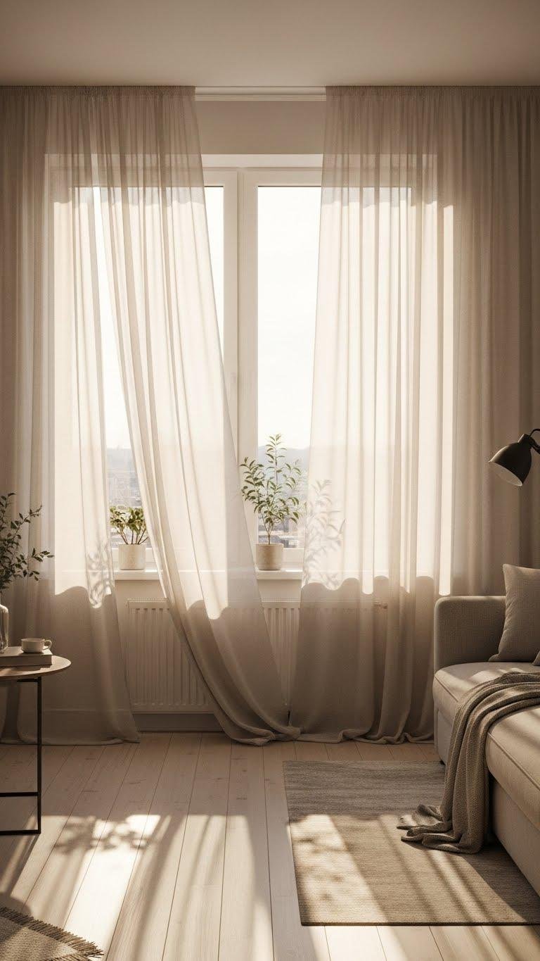 Let in soft, filtered light by swapping heavy curtains for sheer drapes that diffuse glare without darkening the room. You’ll choose soft voile or lightweight sheer panels to soften shadows, preserve views, and keep the space airy. Hang them where they catch breezes so fabric moves; that gentle motion frees the room’s energy and makes your small apartment feel open, calm, and lived-in.