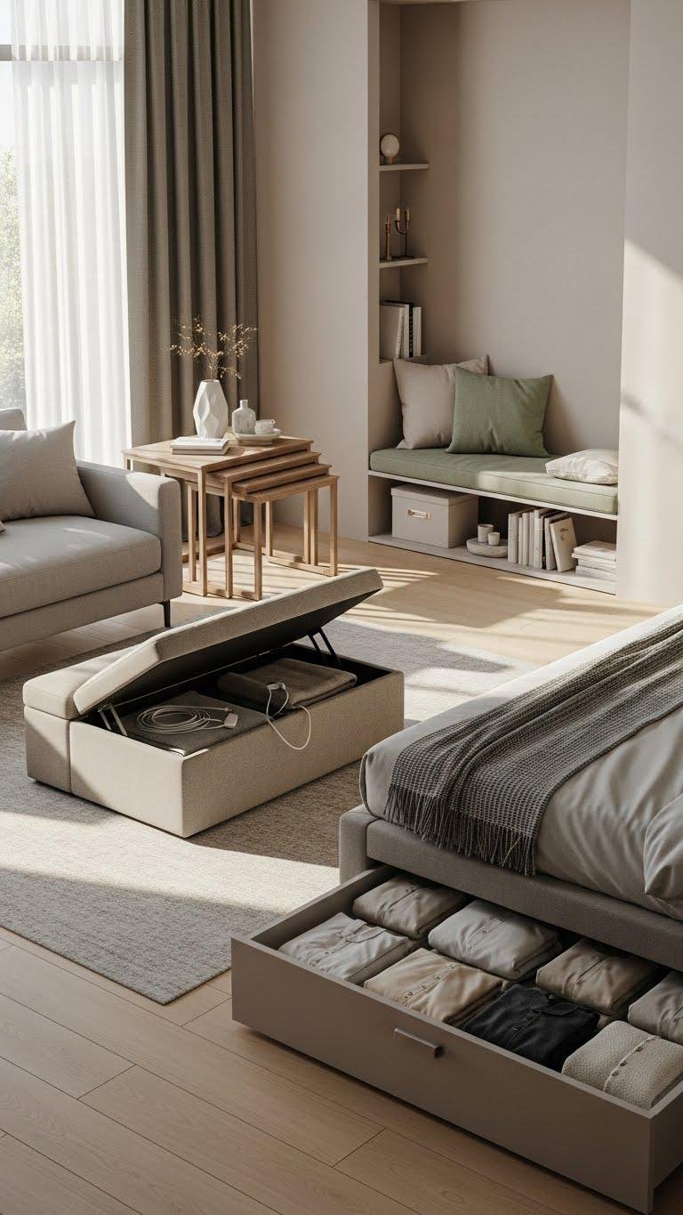 Nesting tables keep surfaces available without crowding the room, but to truly sustain that calm look you’ll want more pieces that hide everyday items out of sight. Use under bed drawers for off-season gear, ottomans with hidden compartments for blankets and chargers, and recessed seating benches that conceal books.