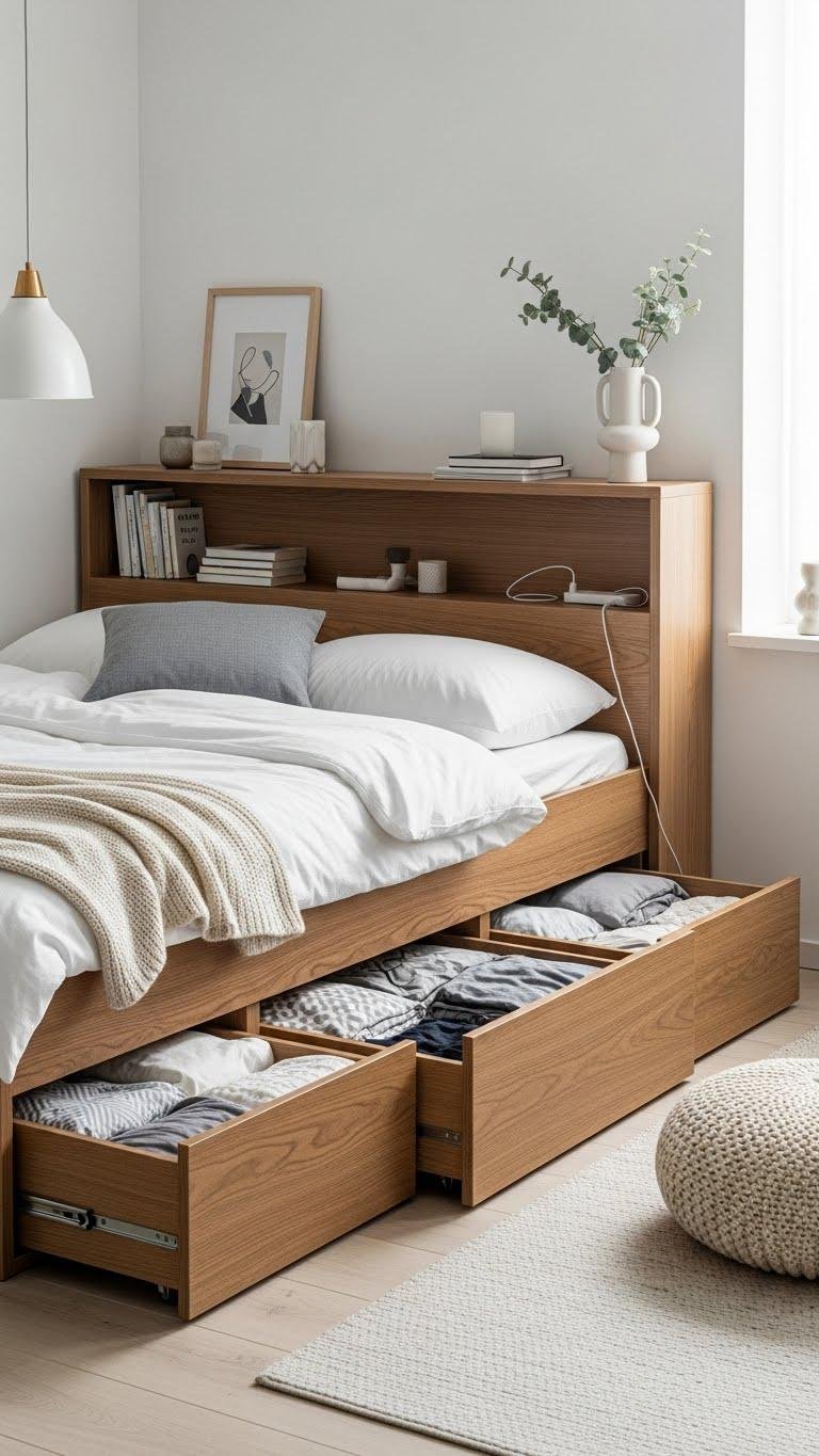 Choose a bed with built-in drawers to turn a focal piece into discreet storage that reduces clutter and maximizes floor space. You’ll gain practical under bed storage for linens, seasonal clothes, or gear while keeping surfaces clear. Pair drawers with a built in headboard that hides books and chargers.