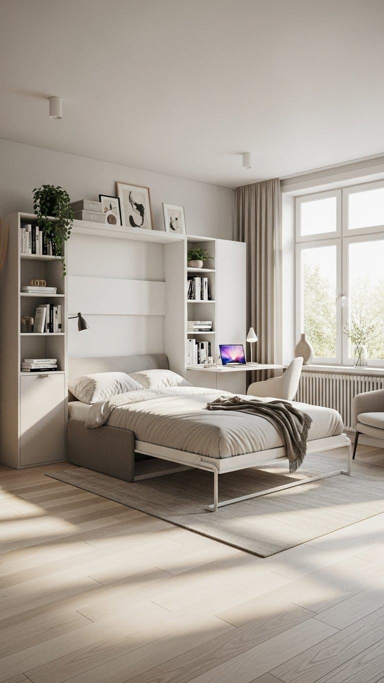 You’ll appreciate the hidden mechanism that tucks sleep away cleanly, freeing walking room and visual calm. Combine it with vertical storage and minimalist finishes so your space stays flexible, airy, and truly yours.