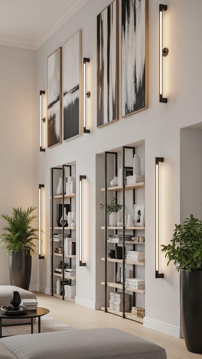 Because your floor space is limited, look up: tall shelving and vertical artwork draw the eye upward, create visual height, and give you more storage without crowding the room. You’ll choose slim, open units, pair them with vertical lighting for ambience, and balance art scales to enhance freedom and flow. Add tall planters to soften lines and bring life without sacrificing space.