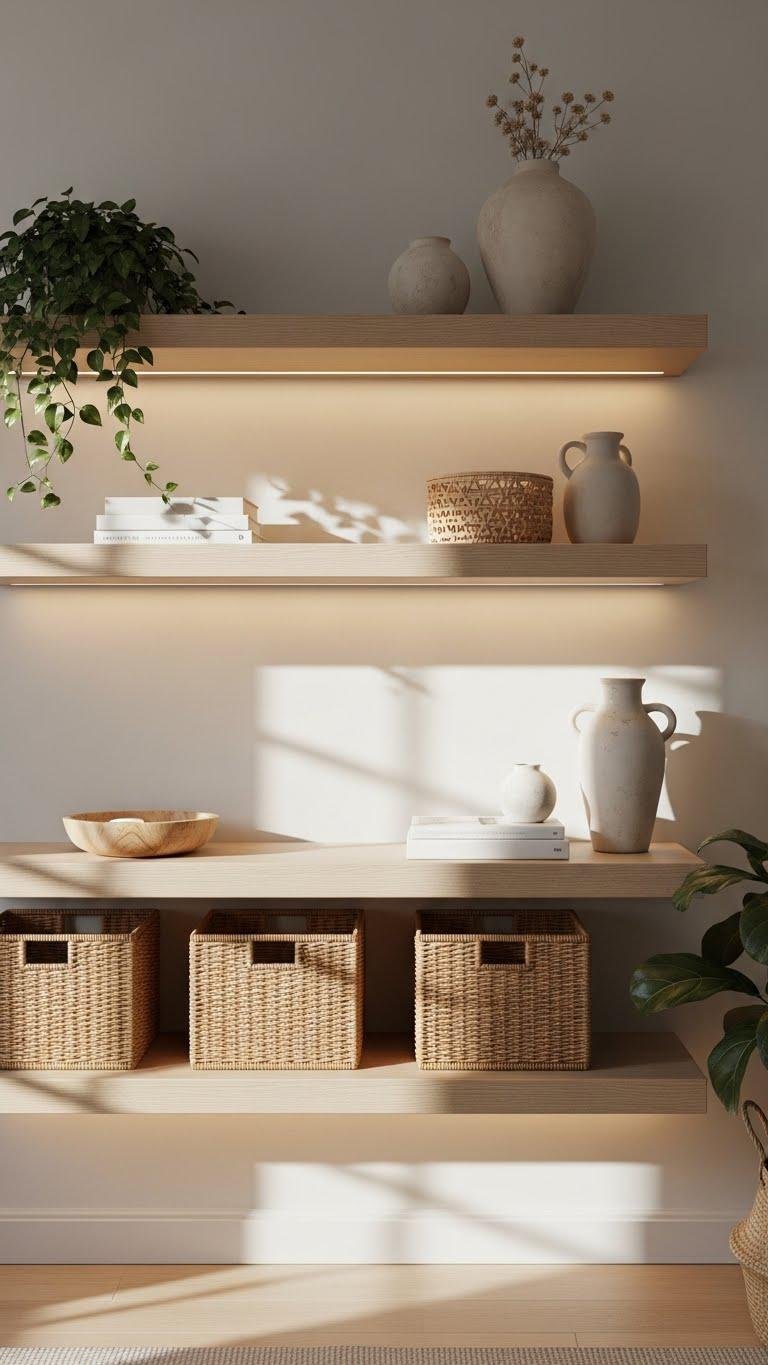 Integrate seamless lighting beneath shelves to highlight textures and create open, liberating zones without clutter—practical, elegant, and utterly freeing.