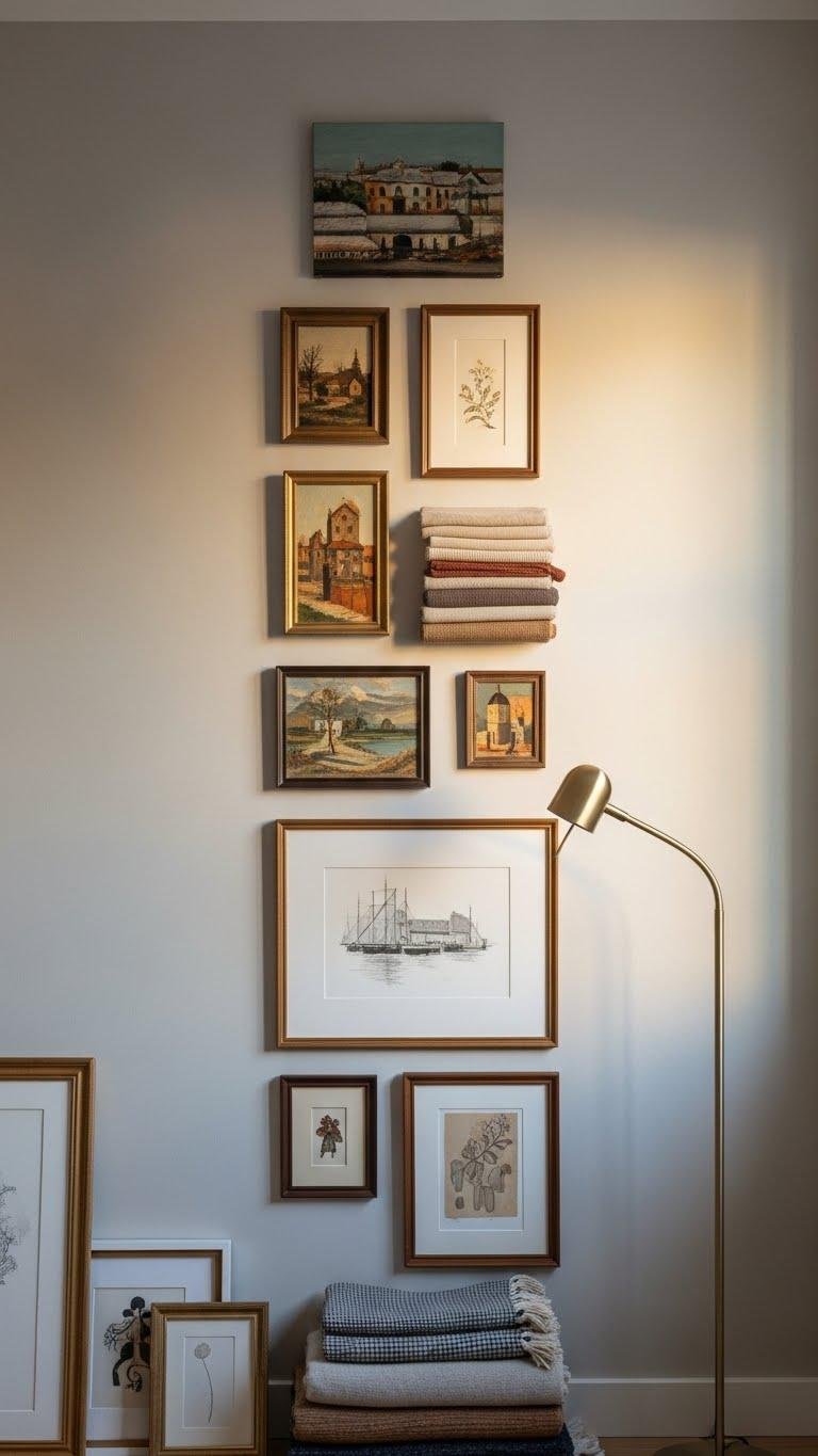 Often you’ll want to stack frames vertically to draw the eye up and make ceilings feel taller; align the bottoms and spacing carefully, start the sequence just above eye level, and keep consistent framing or matting to maintain a streamlined, gallery-like climb that elongates the room without clutter. Create a vertical gallery with mixed art and stacked textiles, anchor it beside a slim lamp, and let space breathe.