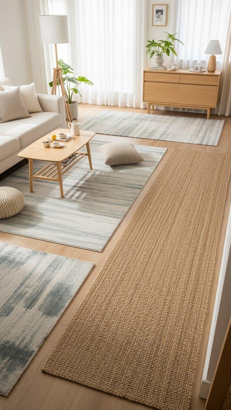 Keep rugs pared back or pick simple, light designs so the floor feels like part of the room, not a competing element. You’ll favor minimalist mats or a textured jute runner to define zones without crowding space. Choose pale tones, low pile, and subtle patterns so sightlines stay open. Fewer, lighter rugs give you freedom to move and breathe in a small apartment.