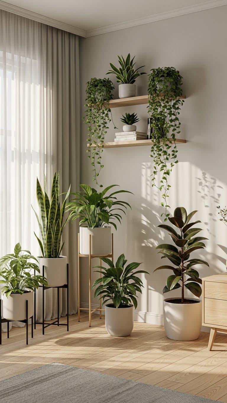 Bringing in plants lets you add life and vertical interest without bulky furniture, so you can make the room feel airy and curated. Choose air purifying plants for cleaner, lighter air and place them on shelves or stands. Use vertical trailing plants to draw the eye upward without crowding floors.