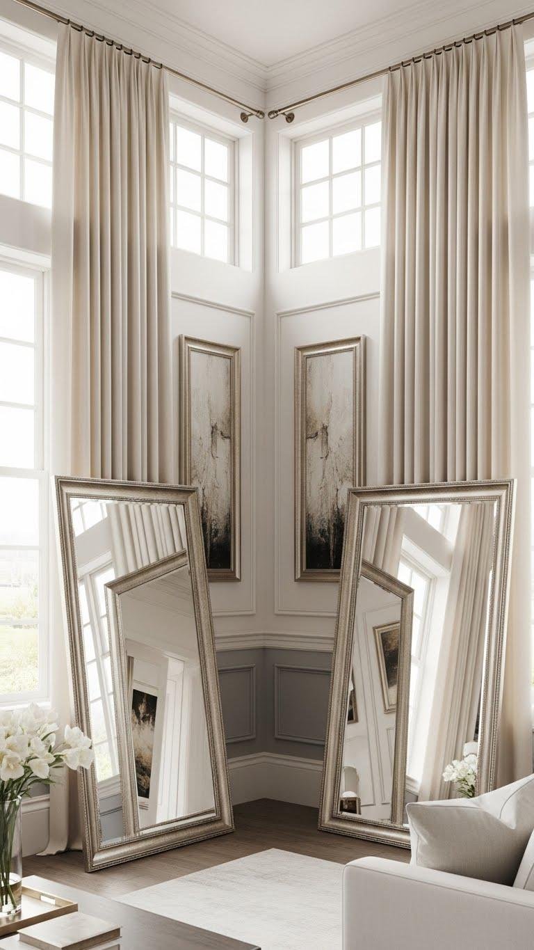After you’ve lifted the vertical lines with full-height drapes, amplify light and depth by placing mirrors opposite your room’s focal points. You’ll reflect views, broaden sightlines, and bounce natural light into corners.